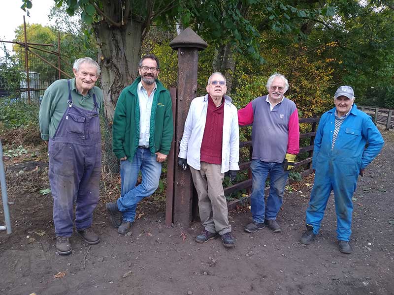 Some of the gatepost erecting team - Steve Ryder, Tim Part, Tim Masson, Robert Heron, Alan Whiffen - 9-Oct-25. Photo. Alan Price